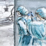 Masques, charlottes, lunettes, elles s’agitent, astronautes de première ligne. Elles font front dans leurs fragiles armures. »